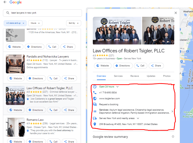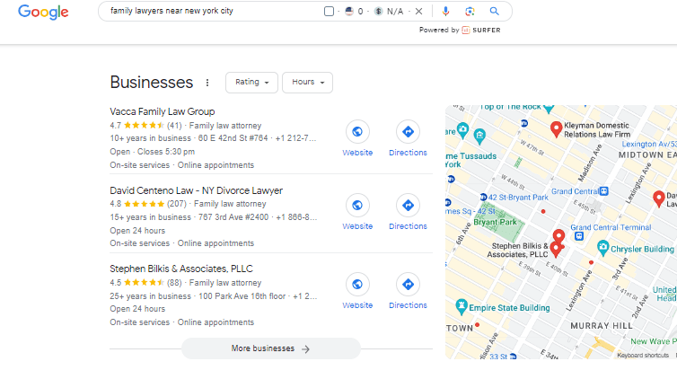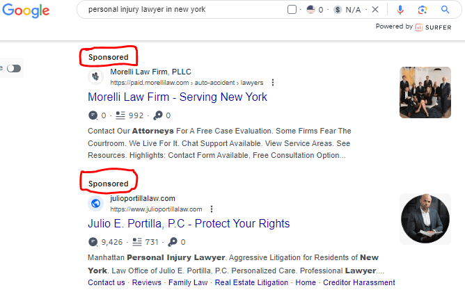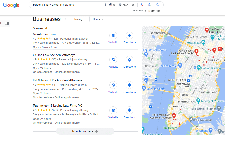 Start by checking if you’re already ranking for location-based keywords that target your specific region. For example, if you’re a personal injury attorney in New York, you’d want to see if your website pops up when someone searches for “personal injury attorney in New York” or similar phrases.