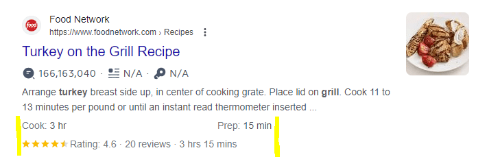 Leveraging schema markup can result in the display of rich snippets in the Search Engine Results Page (SERP). Rich snippets enhance the appearance of your listing and provide additional information to users. They typically appear in a format like this: